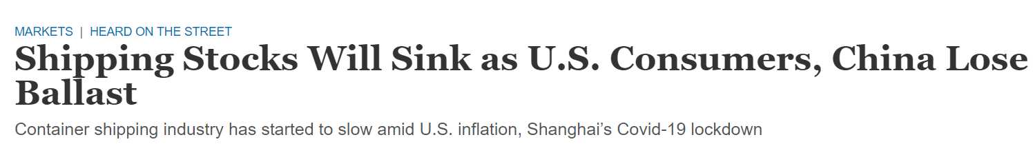 华尔街日报15日报道,Drewry Shipping Consultants汇整的世界货柜指数(World Container Index)持续下滑,暗示美国等已开发国家的消费者开始减少购买商品,原因是财政刺激退场、40年高的通胀伤害薪资成长,经济重启让民众重回服务业消费、美联储积极升息等。另一原因是,上海疫情封控似乎打断了中国出货物流,压抑货柜航运需求。