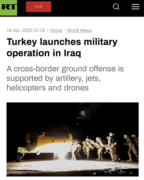 FX168财经报社(香港)讯 据路透社、今日俄罗斯等媒体援引土耳其阿纳多卢通讯社报道,土耳其国防部长阿卡尔(Hulusi Akar)当地时间4月18日上午宣布,土耳其发起了一项新的大规模跨境军事行动,目标是打击在伊拉克北部的库尔德工人党武装分子。这次行动既涉及突击队的地面进攻,也涉及使用喷气式飞机、直升机和无人机的广泛空袭行动。