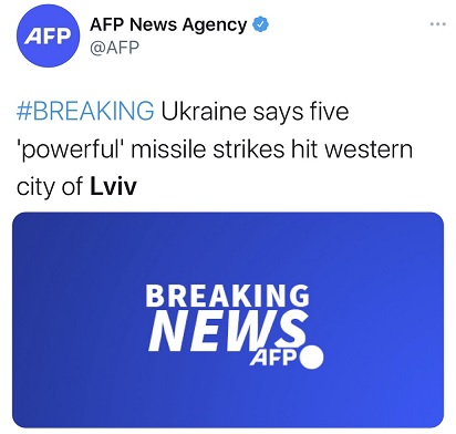 美国有线电视新闻网记者Jim Sciutto在推特上发布现场图,并写道:“今天早上利沃夫遭遇五次导弹袭击。城市上空升起烟雾。”
