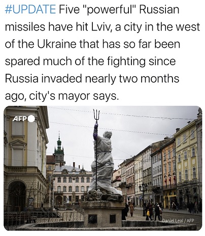 BBC记者也在利沃夫,亲眼看到导弹攻击,在导弹出现前45分钟,市区响起了空袭警报,目前看到爆炸现场冒出黑色与灰色烟雾。