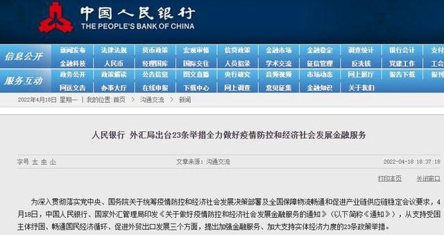 FX168财经报社(北美)讯 周一(4月18日),中国人民银行官网发布消息,中国人民银行、国家外汇管理局印发《关于做好疫情防控和经济社会发展金融服务的通知》(以下简称《通知》),从支持受困主体纾困、畅通国民经济循环、促进外贸出口发展三个方面,提出加强金融服务、加大支持实体经济力度的23条政策举措。