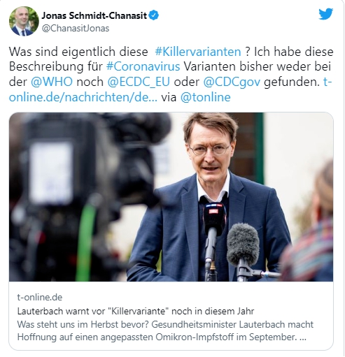 病毒学家施密特-查纳西特告诉德国《图片报》:“什么是杀手变种?我从来没听说过,世卫组织、欧洲和美国疾控机构都没有相关说法。”