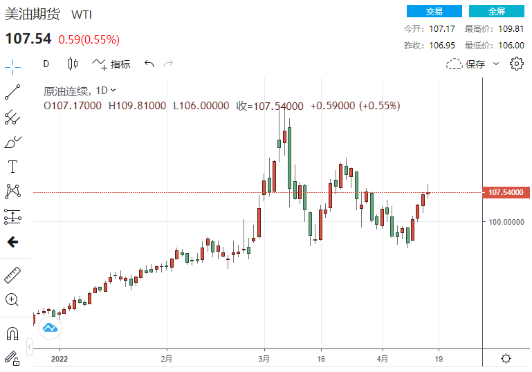 截至发稿,美国WTI原油期货上行0.84美元,涨幅0.79%,现报107.34美元/桶;布伦特原油期货上探1.26美元,涨幅1.12%,报112.42美元/桶。