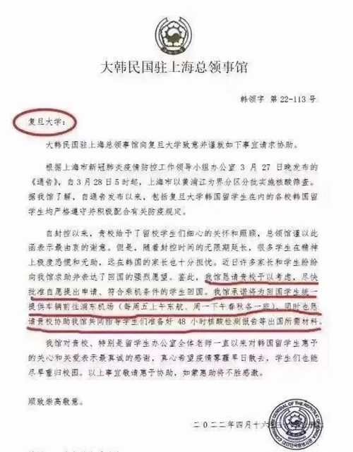 大韩民国驻上海总领事馆在给复旦大学的求助信中写道,随着封控时间的无限期延长,很多学生在精神上极度恐慌和无助,远在韩国的家长也十分担忧。近日许多家长和学生纷纷向我求助并表达了回国的强烈愿望。鉴此,恳请贵校予以考虑,尽快批准自愿提出申请、符合乘机条件的学生回国。韩国承诺将为回国留学生统一提供车辆前往浦东机场。
