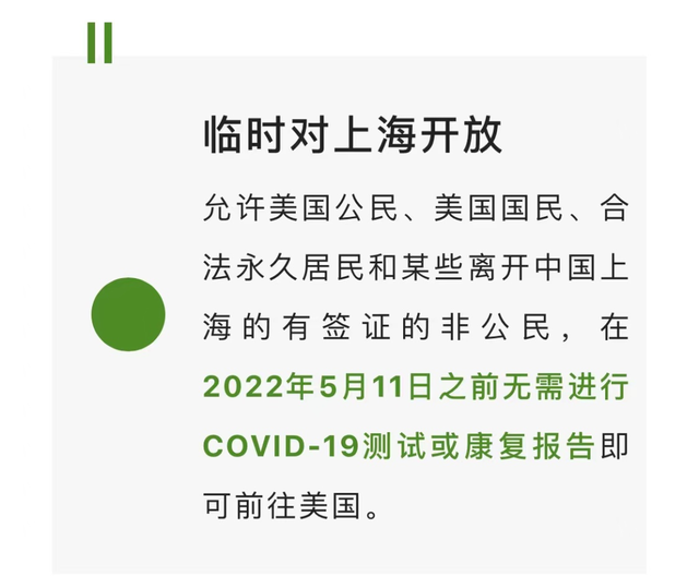 此前,美国驻上海总领事馆下令撤离非紧急工作人员。美国上周五宣布允许符合条件的乘客,从上海出发时,豁免起飞前1天的检测要求。
