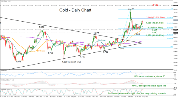 24K99讯 周二(4月19日)亚市盘中,现货黄金略微下跌,现报1977美元/盎司附近。机构XM.Com最新撰文,对金价技术前景进行分析。随着看涨情绪的增加,金价有望涨向2000美元/盎司。一旦突破这一水平,金价有望涨向历史高位。