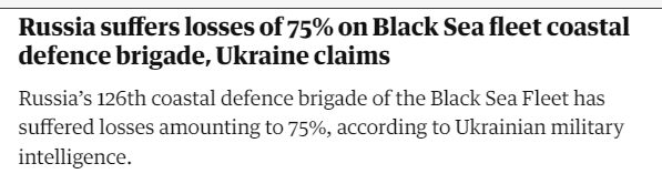 “根据掌握的准确信息,黑海舰队第126海防旅的损失达75%,”乌克兰武装部队总参谋部发布的最新作战报告中写道。官员们还声称,俄罗斯黑海海军第810海军陆战队独立旅有158名士兵被乌克兰军队击毙,另有约500人受伤,70人被认为失踪。