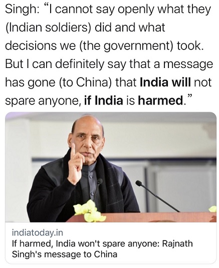 他说:“我不能公开说他们(印度士兵)做了什么,我们做了什么决定。但我可以肯定地说,已经(向中国)传达了一个信息:如果印度受到伤害,印度不会放过任何人。”