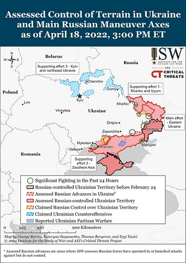 乌克兰国家安全与国防委员会秘书丹尼洛夫4月18日在电视直播节目中表示,俄军当天试图在沿顿涅茨克、卢甘斯克和哈尔科夫一线突破乌军防线。位于卢甘斯克地区西北部的城市克列缅纳亚和一个小镇已被俄军突破,但战斗仍在继续。