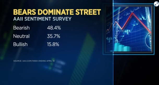 Emanuel指的是最新的AAII投资者情绪调查。在截至4月13日的一周,看跌者与看涨者的比例约为3:1。不过,Emanuel将这一结果视为一个关键的反向指标。