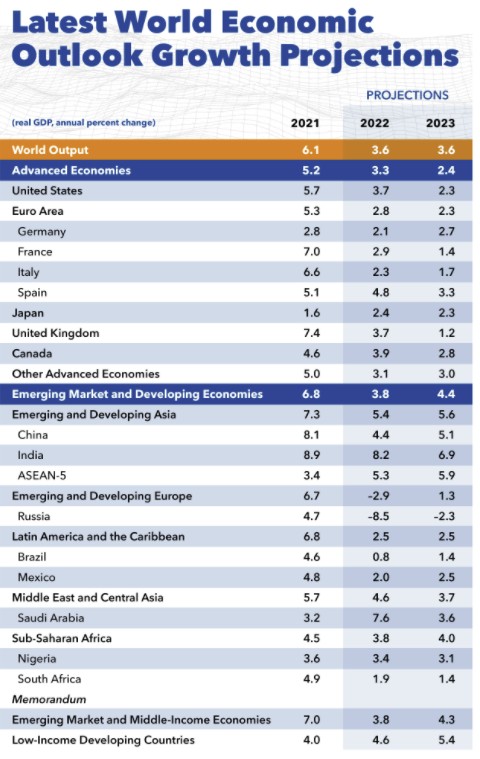 俄罗斯在国际货币基金组织的报告中出现了最大的降级,该国经济现在预计今年将收缩8.5%(与入侵前预测的2.8%的增长相比)。西方对该国的制裁切断了俄罗斯的进出口贸易,其他措施在很大程度上使俄罗斯中央银行和私人银行与全球金融体系脱节。
