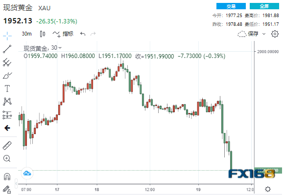 美市早盘,现货金短线大跌30美元,低见1951.17美元。