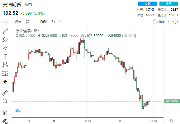 美市盘中,布伦特原油下跌约5.7%,至106.77美元/桶低点;美国WTI原油也下跌近6%,至101.51美元低点。