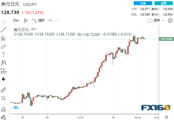 美元/日元的涨幅最为显著,一度触及2002年5月以来的最高水平128.91。