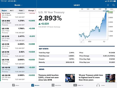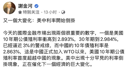 谢金河19日在脸书撰文表示:“今天的国际金融市场出现两个很重要的数字,一个是美国10年期国债收益率冲高到2.893%,30年期到2.984%,已经逼近3%的警戒线,而中国的10年期国债收益率是2.863%。”