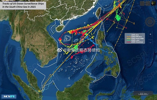 SCSPI称,2021年,以海洋监视船为代表的美军海上侦察力量的活动强度持续走高,美军拥有的五艘海洋监视船“胜利”号、“能干”号、“有效”号、“忠诚”号和“无瑕”号都先后前往南海开展作业,活动时长累计达372舰日,平均每天都至少有一艘海洋监视船在南海活动,几乎没有“空窗期”。