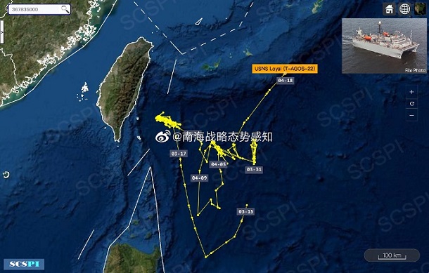 长期追踪美军动态的中国智库“南海战略态势感知计划”(SCSPI)4月18日表示,3月15日以来,美国海军“忠诚”号海洋监视船一直在巴士海峡以东海域高强度活动,4月18日刚刚结束作业。