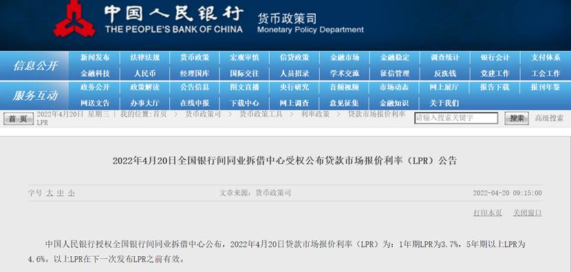 4月20日,据央行官网,中国人民银行授权全国银行间同业拆借中心公布,2022年4月20日贷款市场报价利率(LPR)为:1年期LPR为3.7%,5年期以上LPR为4.6%,两类均与上期保持一致。以上LPR在下一次发布LPR之前有效。