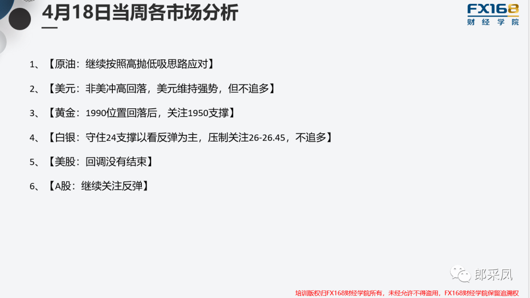 具体盘面跟踪,也欢迎添加微信FX168FXS加入实战点评班或系统课程的学习。由于每个投资者的资金量大小,以及对风险承受能力不同,策略中未提供具体止损位,不过投资者需知,好的防守就是进攻,务必给每个单子设好止损。正常而言,止损可根据不同品种的波动率做调整。