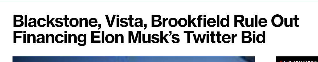但据知情人士透露,包括黑石集团(Blackstone Inc.)与Vista Equity Partners在内的私募股权公司,已经排除为马斯克收购推特提供融资的可能性。