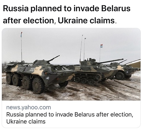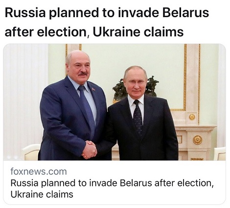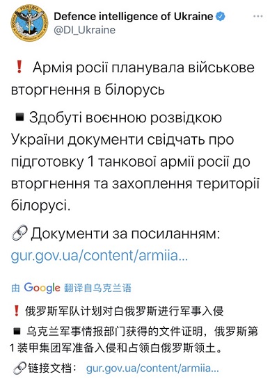 乌国防部声称:“在白俄罗斯伪造总统选举之后,俄罗斯联邦制定了入侵和镇压民众抗议的计划。俄军占领白俄罗斯的借口是避免俄罗斯‘在欧洲大陆地区与西方北约成员国发生区域性或大规模战争’。”