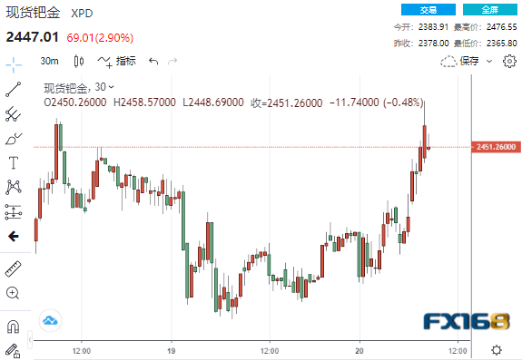 与此同时,现货钯金日内涨幅扩大至超4%,高见2476.55美元/盎司。