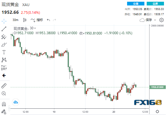美市盘中,现货黄金上涨不到0.2%,从两周低点反弹,现交投于1950美元/盎司上方不远处,日内最高触及1955.03美元/盎司。