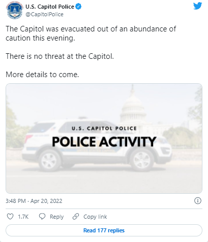 FX168财经报社(北美)讯 当地时间周三(4月20日)晚间,美国国会警察对国会大厦进行了疏散,称他们正在“追踪一架可能构成威胁的飞机”。