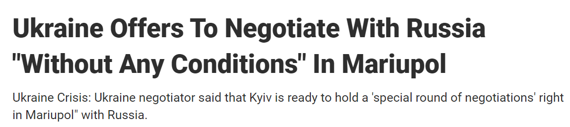 乌克兰谈判代表兼总统助理波多利亚克(Mykhailo Podolyak)周三晚间做出回应:“是的,没有任何条件,我们准备在马里乌波尔举行特别一轮谈判。1对1,或是可能2对2。这是为了拯救我们的人,军人、平民与儿童,生者与伤者的每个人,因为他们是我们的,因为他们永远在我心里。”