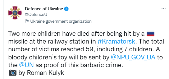 英国卫报引述乌克兰国防部推特帖文,俄罗斯对铁路的袭击也导致包括儿童在内的平民死亡,但这并没有阻止工人出现以确保火车继续运行。