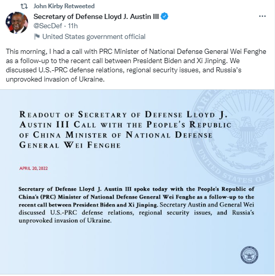 据五角大楼发言人柯比(John Kirby)引述奥斯丁的推特帖文,其中写道:“今天上午,我与中国国防部长魏凤和将军通了电话,作为拜登总统与中国国家主席习近平最近通话的后续行动。我们讨论了中美国防关系、地区安全问题,以及俄罗斯无端入侵乌克兰。”