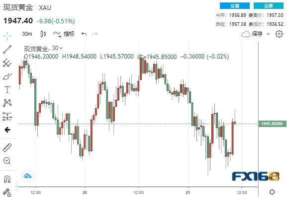 (现货黄金30分钟走势图,来源:FX168)