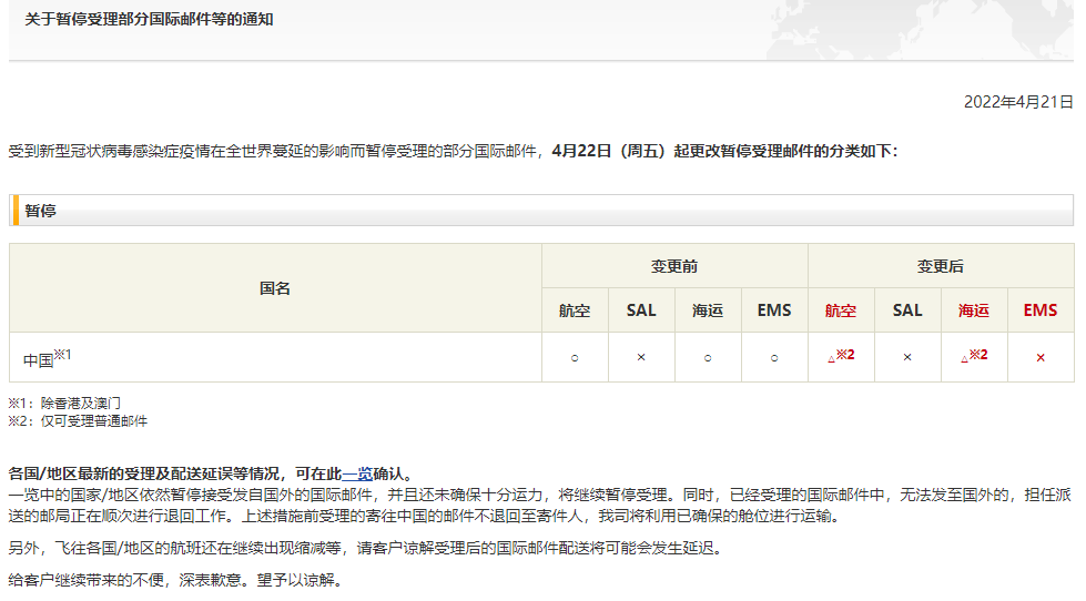 FX168财经报社(北美)讯 周四(4月21日),日本邮政公司在官网发布消息称,受新冠疫情影响,决定从4月22日起,暂停发往中国(港澳台地区除外)的EMS服务、航空及海运包裹服务。寄往中国的书信类仍将继续正常受理。EMS等服务的恢复时间暂未公布。