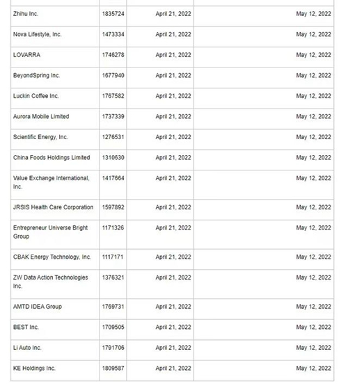具体名单为:知乎、诺华家具、LOVARRA、万春医药、瑞幸咖啡、极光移动、Scientific Energy、中国食品、Value Exchange International、泽尔西西医疗集团、Entrepreneur Universe Bright Group、中比能源、中网载线、尚乘国际、百世集团、理想汽车和贝壳。