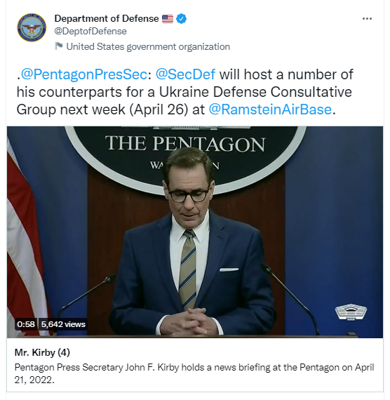 据美国五角大楼发言人柯比(John Kirby)所说,美国国防部长奥斯丁(Lloyd Austin)将于4月26日在德国西南部的拉姆施泰因空军基地会见盟友。他说道:“目标是召集来自世界各地的利益相关者,就乌克兰最新的国防需求举行一系列会议,并确保乌克兰的长期安全和主权得到尊重和发展。”