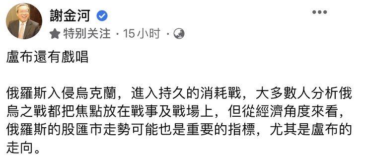 俄乌之战会持续多久?谢金河推测,只要看卢布的走势就可略知一二。如果卢布强势,代表俄罗斯拿石油,天然气换资金的力道仍强劲,战争可能持续很久。接下来的问题在于看美国如何出牌。