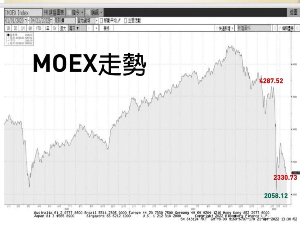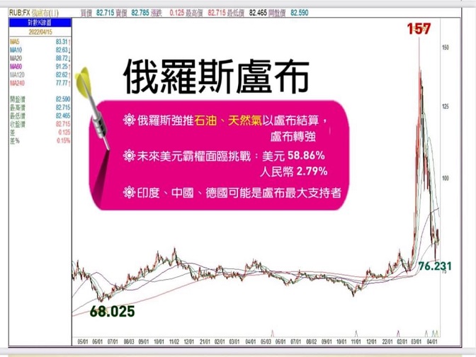 谢金河表示,俄乌战争之前卢布约68兑1美元,战争一开打,俄罗斯股市率先休市,在欧美国家对俄国展开空前经济制裁的那一刻,卢布随之出现崩溃式大跌,最低跌到157兑1美元。俄罗斯股市也一蹶不振。