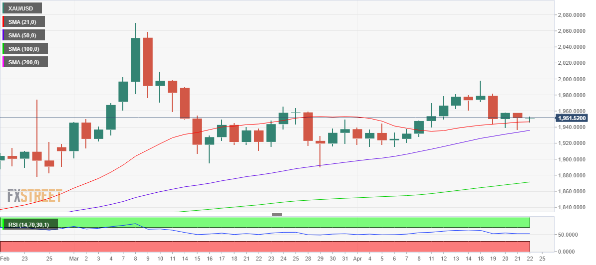 从技术面来看,Mehta指出,黄金日线图显示,只要守住关键的21日移动均线1947美元/盎司,那么多头仍抱有希望。值得注意的是,自4月7日以来,黄金价格从未出现日收盘价低于21日移动均线的情况。