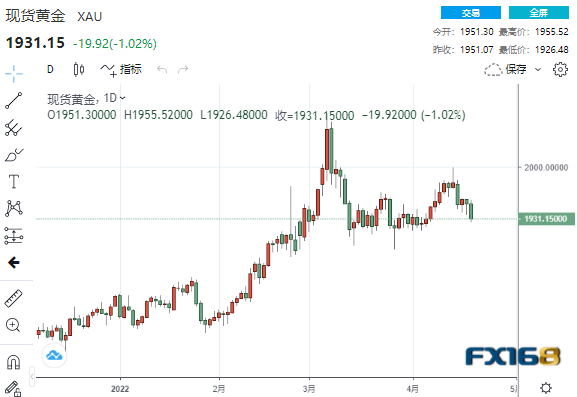 周五(4月22日),COMEX 6月黄金期货收跌0.7%,报1934.30美元/盎司,较周一早间触及的高点下跌近70美元。