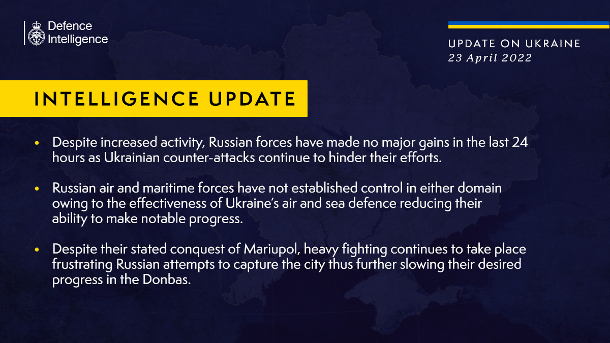 报告也指出,尽管活动有所增加,但由于乌克兰的反击继续阻碍他们的努力,俄罗斯军队在过去24小时内没有取得重大进展。情报写道:“由于乌克兰的空中和海上防御的有效性降低了他们取得显着进展的能力,俄罗斯空中和海上部队尚未在这两个领域建立控制。”