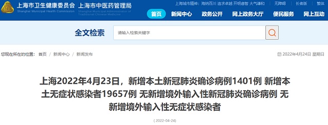 FX168财经报社(香港)讯 根据上海市卫健委4月24日最新通报,2022年4月23日0—24时,上海新增本土新冠肺炎确诊病例1401例和无症状感染者19657例,其中541例确诊病例为此前无症状感染者转归,816例确诊病例和19421例无症状感染者在隔离管控中发现,其余在相关风险人群排查中发现。