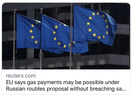 欧盟委员会向欧盟成员国发送了一份文件,解释了天然气支付机制,以避免违反对俄罗斯的制裁。文件说,俄罗斯总统普京3月31日的法令规定的付款程序“允许俄罗斯将俄央行纳入结算,……这是欧盟制裁所禁止的”。同时该文件表示,在不违反欧盟法律的情况下支付天然气费用仍然是可能的。