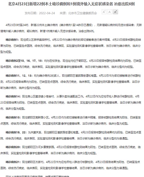 确诊病例19、22:为夫妻关系,现住朝阳区潘家园街道松榆里。4月23日报告核酸检测结果均为阳性,已转至定点医院,综合流行病史、临床表现、实验室检测和影像学检查等结果,当日诊断为确诊病例,临床分型均为普通型。