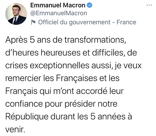胜选后马克龙并在其个人推特表示,在过去五年,法国经历了种种变革,有欢乐的时光,也有艰难的时刻,以及前所未有的危机。他感谢法国人民对他的信任,信任他在接下来的五年中继续领导法国。