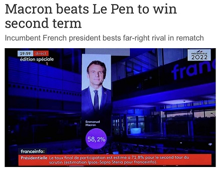 民意调查机构Ipsos & Sopra Steria为法国电视台和法国广播电台进行的投票数据分析,于当地时间24日晚间8点发布预测,马克龙获得58.2%选票,而勒庞的得票率为41.8%,这是继她在2017年大选进入第二轮后,再一次在第二轮与马克龙展开对决。2017年马克龙以66.10%得票率辗压勒庞的33.90%,今年差距明显缩小,勒庞获得该党参加总统大选以来最高得票率。