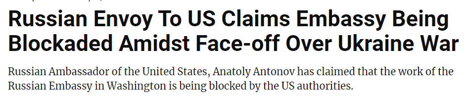 自乌克兰战争爆发以来,美国与俄罗斯之间的外交紧张局势越演越烈,美国通过对克里姆林宫实施严厉禁运,以及向前苏联国家部署军事援助,来应对无端的军事攻势。俄罗斯大使还声称,通过电话和邮件对他们进行了威胁。