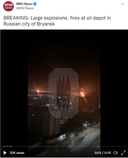 BNO News、RT等外媒消息披露,俄罗斯布良斯克的一个油库发生火灾,该市位于乌克兰附近的罗斯托夫地区。当地居民报告说听到爆炸声,可以在社交媒体视频中听到警笛声。