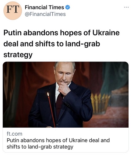 FX168财经报社(香港)讯 俄罗斯入侵乌克兰已经整整2个月,但在各条战线都遭遇挫折。据英国《金融时报》(Financial Times)4月25日最新报道,三名听取俄罗斯总统普京(Vladimir Putin)谈话简报的知情人士表示,普京已对结束俄乌战争的外交努力失去兴趣,转而似乎决心夺取尽可能多的领土。