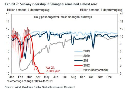 从高盛收集到的快速经济数据继续反映了封锁的影响,包括地铁客运量的数据,近一个月来,地铁客运量几乎保持在零。