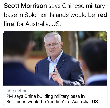 FX168财经报社(香港)讯 澳大利亚总理莫里森(Scott Morrison)当地时间周日(4月24日)警告称,中国在所罗门群岛建设军事基地,对于澳大利亚和美国来说,这将是一条不能触碰的“红线” 。但莫里森并未透露如果“红线”被越过,将如何作出回应。